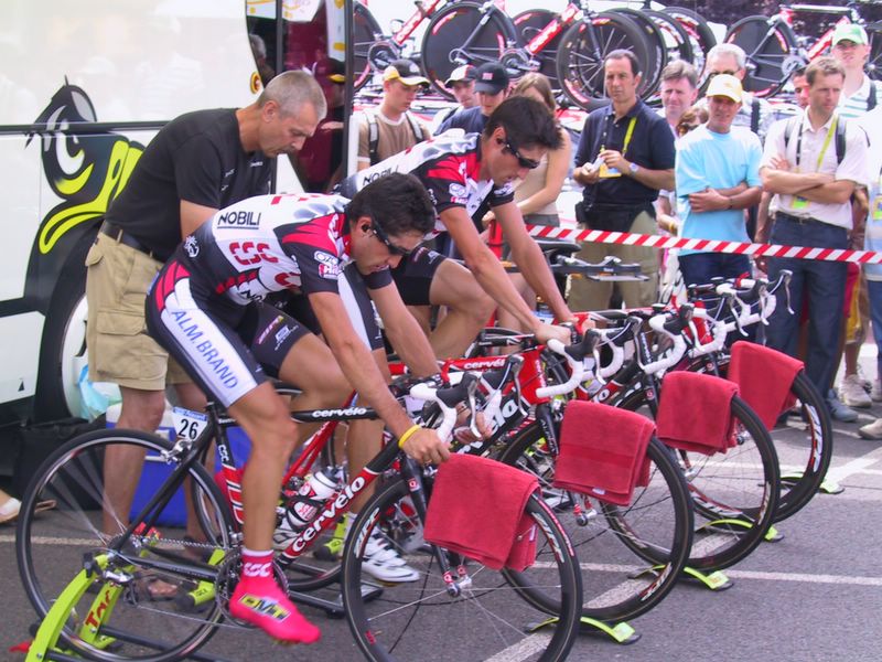 France Day 2 -- Carlos Sastre and Bobby Julich warming up for the TT